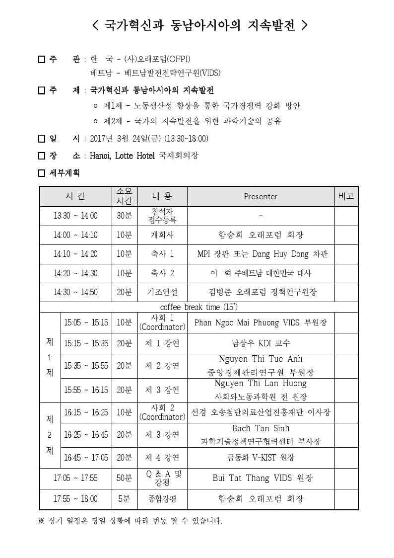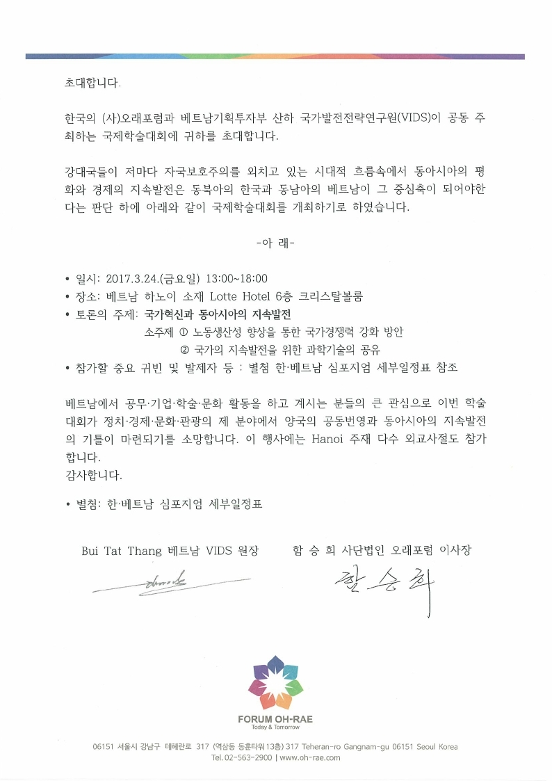 공지 사항 오래포럼-국제학술대회 초대(주제 : 국가혁신과 동남아시아의 지속발전) by 관리자 2017-03-24 999+ 안녕하세요? 코참 사무국입니다. 한국의 (사)오래포럼(함승희 이사장)과 베트남기획투자부 산하 국가발전전략연구원(VIDS)이 공동 주최하는 국제학술대회에 초대합니다. 3월 17일(금)까지 코참 사무국(info3@korchamvietnam.com)으로 신청하시기 바랍니다. 감사합니다. 첨부파일 한베트남 국제심포지엄 초대장.pdf 257.39 KB 한국베트남_국제심포지움_세부일정 계획안 (1).pdf 130.51 KB 댓글(0) 등록