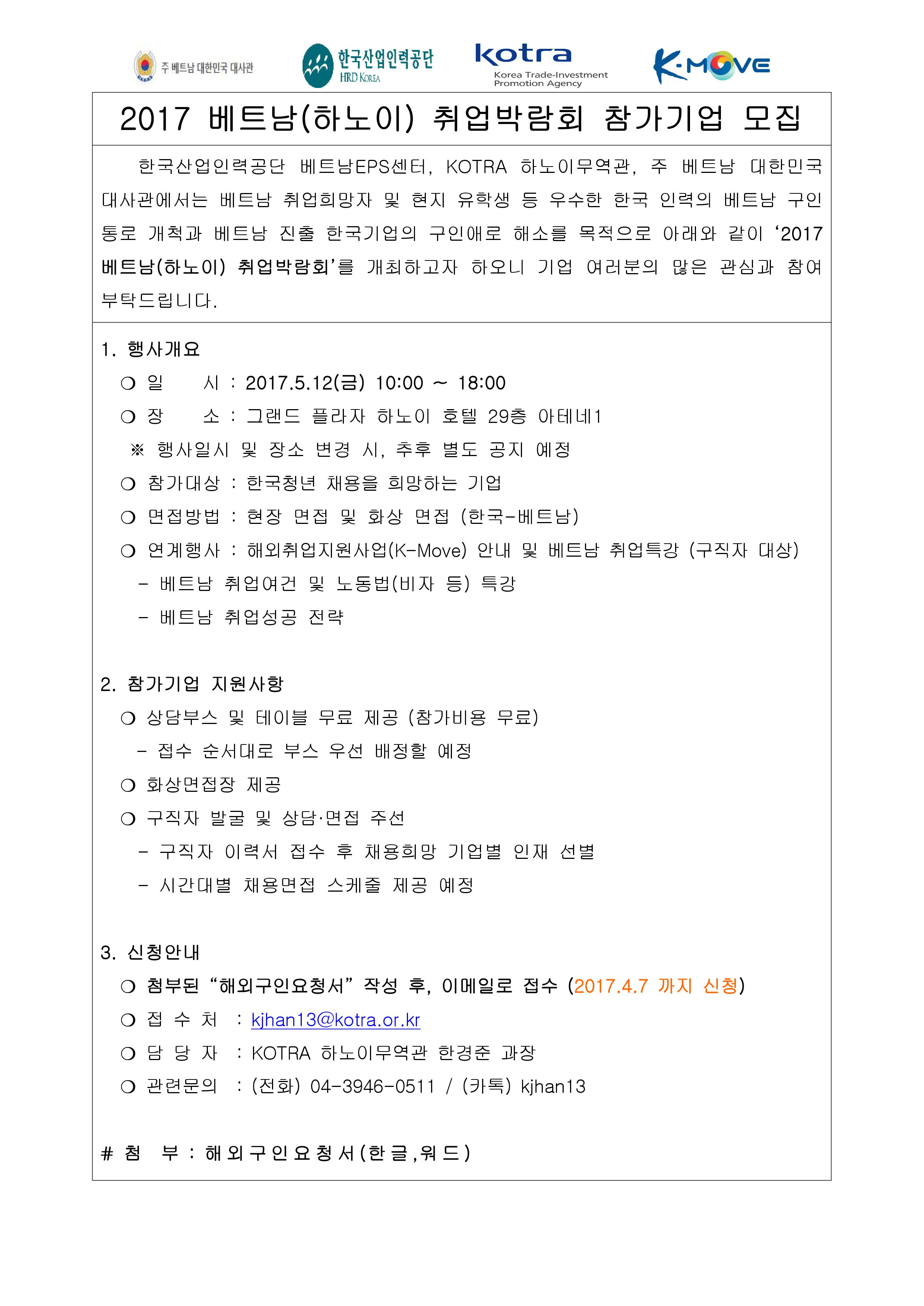 공지 사항 2017 베트남(하노이) 취업박람회 참가기업 모집 by 관리자 2017-05-12 999+ 첨부파일 2017베트남취업박람회참가신청안내.hwp 502.5 KB 해외 구인 요청서.doc 769.5 KB 해외구인요청서(한글) (1).hwp 504 KB 댓글(0) 등록