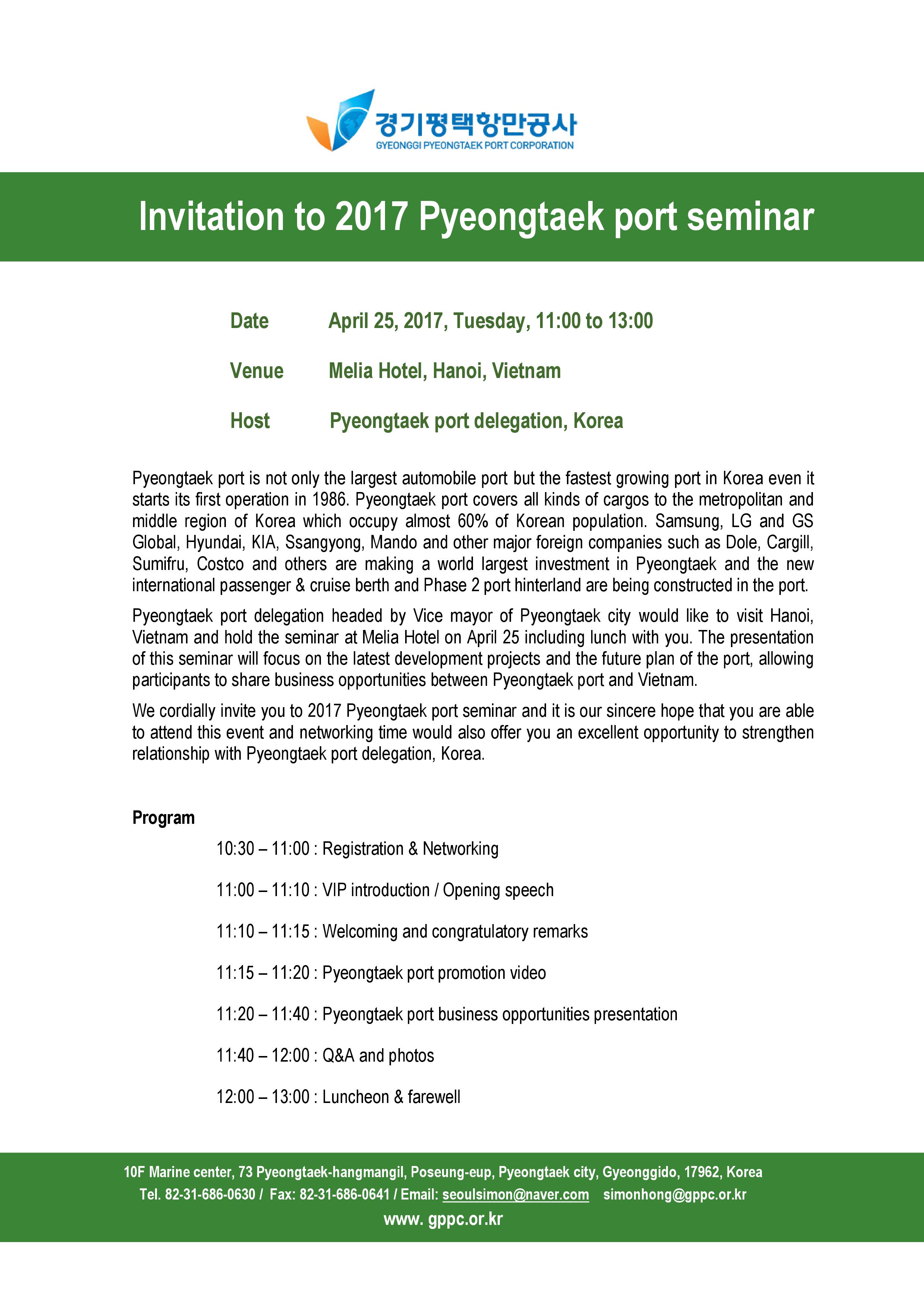 공지 사항 2017 평택항 물류 환경 설명회 개최 안내 by 관리자 2017-04-25 999+ 참가신청 및 문의: 1) 경기평택항만공사 홍성기 과장 Tel: 82-31-686-0630 Email: seoulsimon@naver.com 2) 코참 사무국 Tel: 04 3555 3341 Email: info3@korchamvietnam.com 댓글(0) 등록