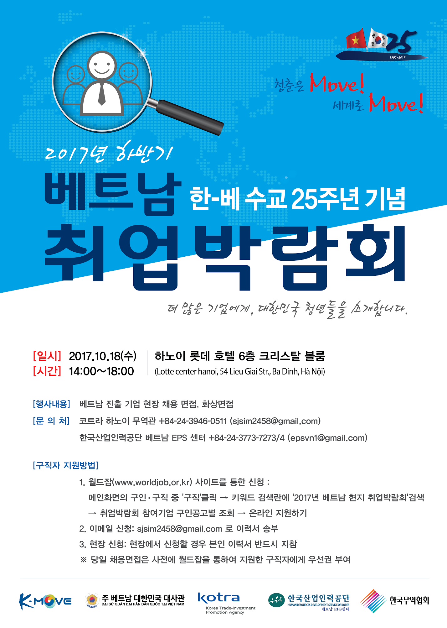 베트남 진출기업들의 인력난을 해소하고, 우수 한국 인력의 베트남 취업을 위해 진행되는 본 행사는 한-베 수교 25주년 기념행사의 일환으로 진행될 예정입니다.