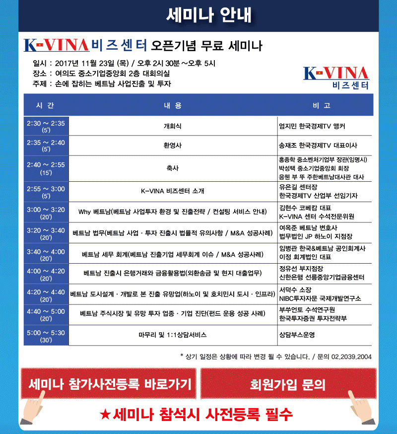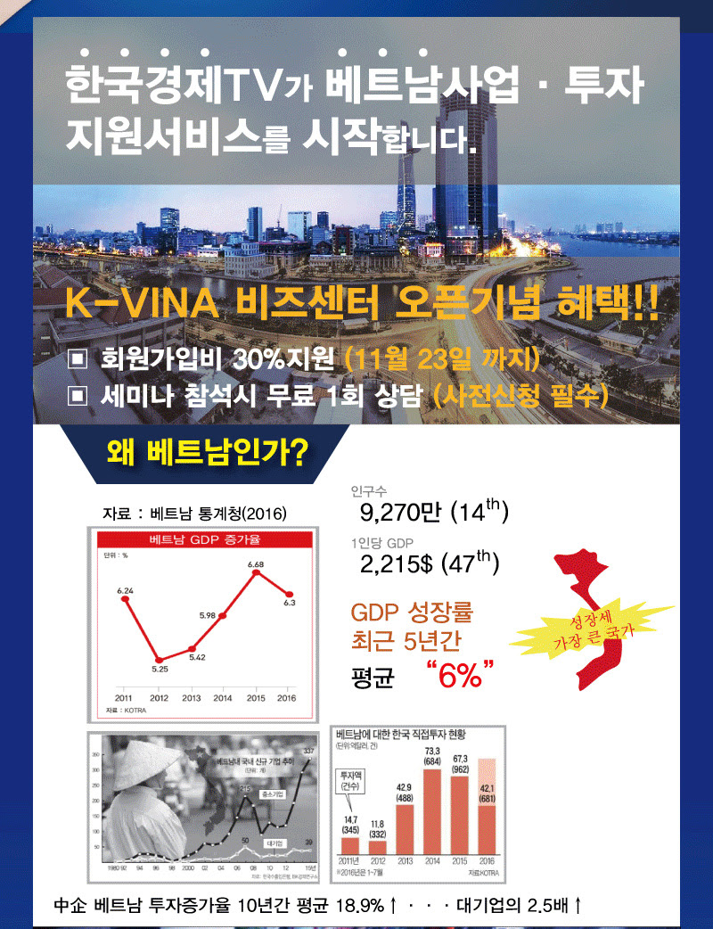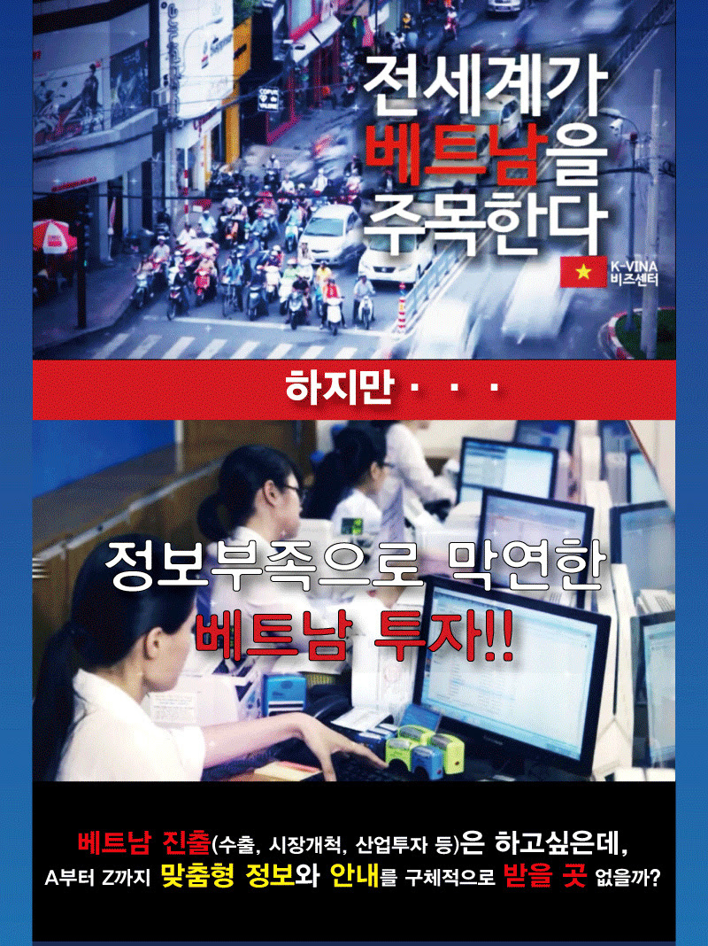 공지 사항 [K-VINA 비즈센터] - 손에 잡히는 베트남 사업진출 및 투자 무료 세미나 by 관리자 2017-11-23 999+ 첨부파일 K-VINA Bizcenter seminar.hwp 24.5 KB Introducing K-VINA Bizcenter.hwp 26.5 KB 댓글(0) 등록