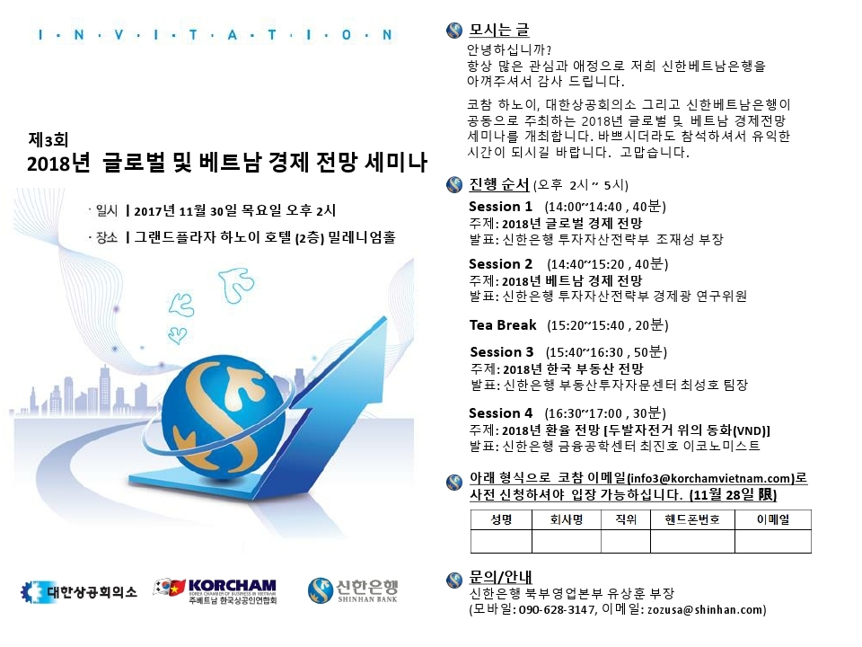 코참 하노이, 대한상공회의소 그리고 신한베트남은행이 공동으로 주최하는 2018년 글로벌 및 베트남 경제전망 세미나를 개최합니다.