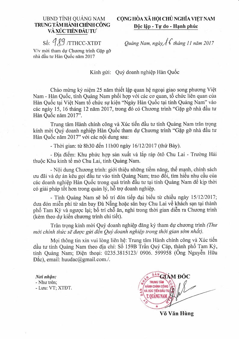 이에 꽝남성 투자촉진 및 공공행정센터는 “2017년 한국 투자자와의 만남” 프로그램에 한국 기업인들을 초청합니다.