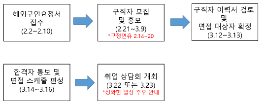 자세한 사항은 아래의 행사 안내문을 참조 부탁드리며, 참가를 원하는 기업 관계자분들께서는 첨부드린 해외구인요청서를 작성하여 sjsim2458@gmail.com으로 2월 10일(토)까지 회신해주시면 대단히 감사드리겠습니다.