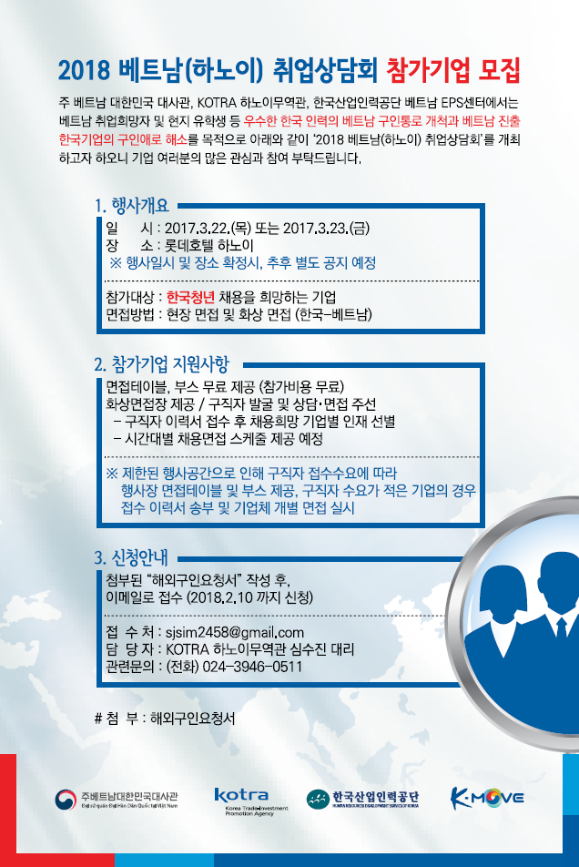 주 베트남 대한민국 대사관, KOTRA 하노이 무역관, 한국산업인력공단 베트남 EPS 센터에서는 베트남 진출 한국기업의 구인애로 해소를 위해 아래와같이 '2018 베트남 취업상담회'를 개최하고자 합니다.