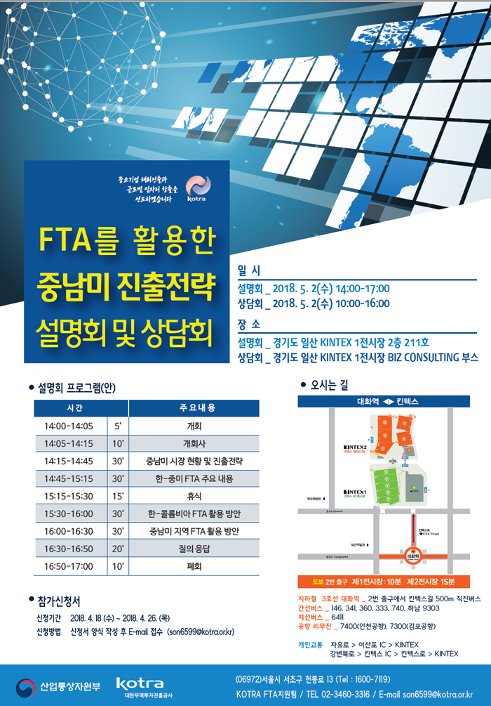 Kotra FTA 지원팀 요청으로 드리는 'FTA를 활용한 중남미 진출전략 설명회 및 상담회' 안내입니다