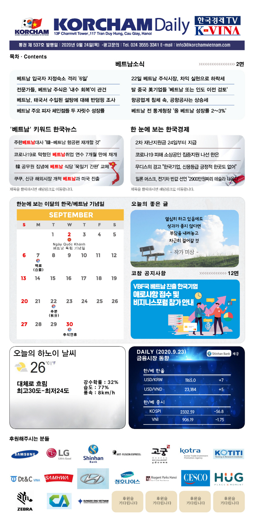 공지 사항 [코참데일리]제537호 2020년 9월 24일 by 관리자 2020-09-24 431 코참에서 코참 데일리 뉴스를 보내드립니다. 코참뉴스 오픈 카카오톡 링크는 아래와 같습니다. https://open.kakao.com/o/gl7Lmgxb 댓글(0) 등록