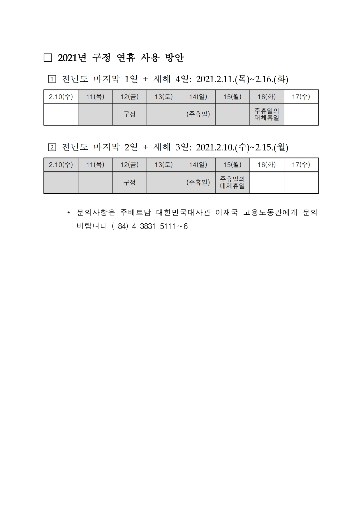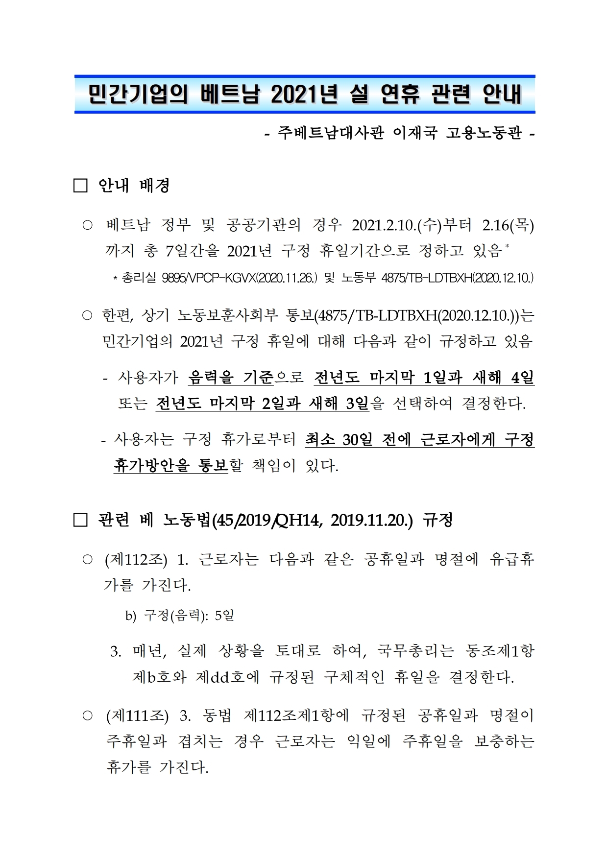 ○ 한편, 상기 노동보훈사회부 통보(4875/TB-LDTBXH(2020.12.10.))는 민간기업의 2021년 구정 휴일에 대해 다음과 같이 규정하고 있음