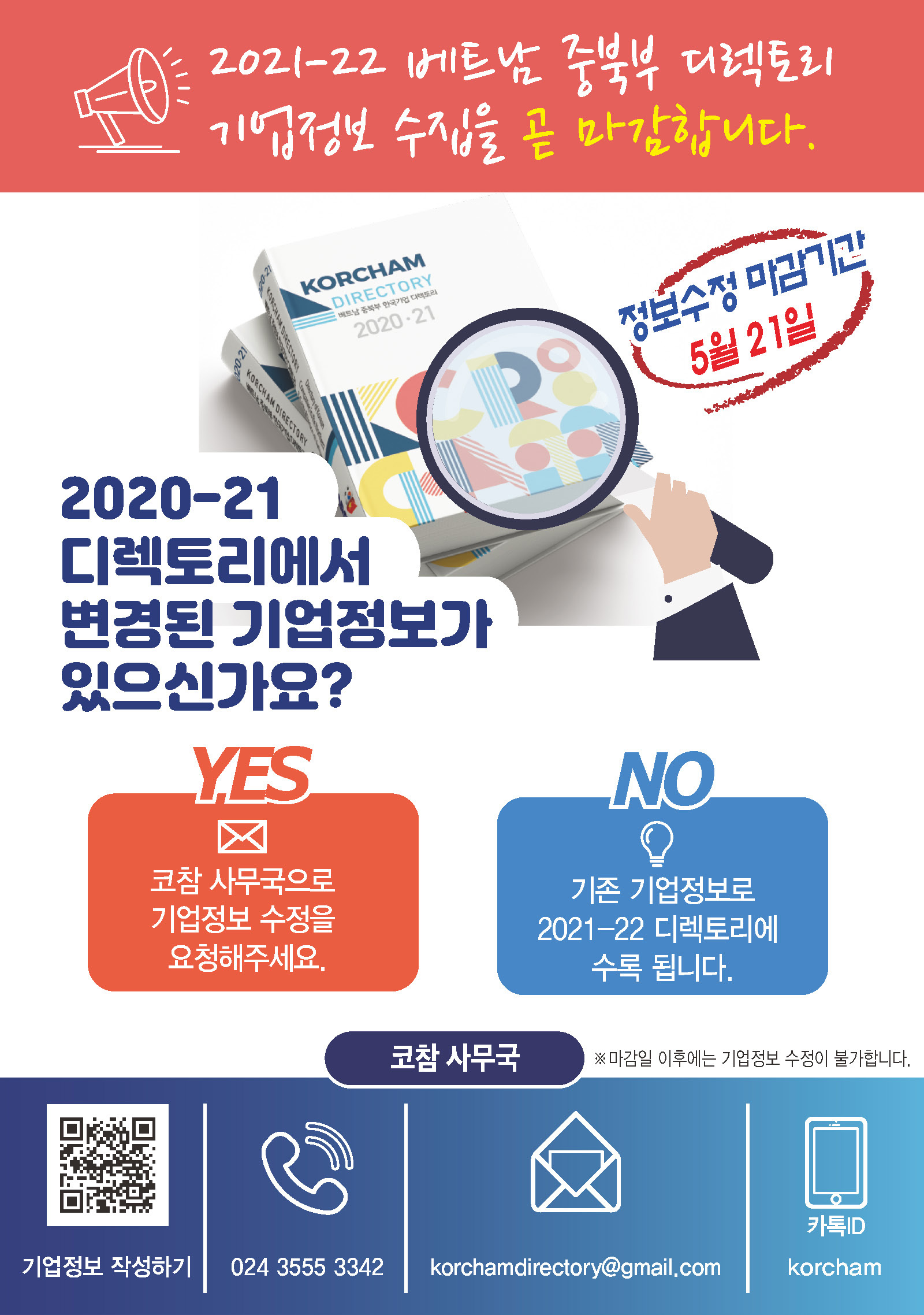 공지 사항 [코참-공지] 2021/22 베트남 중북부 디렉토리 기업정보 수집 마감 안내 by 관리자 2021-05-21 829 ※ 기업정보 수집 방식 방법 1. 첨부된 양식을 작성하시어 korchamdirectory@gmail.com으로 회신 방법 2. 온라인 작성: https://bitly.com.vn/h0hrk5 댓글(0) 등록