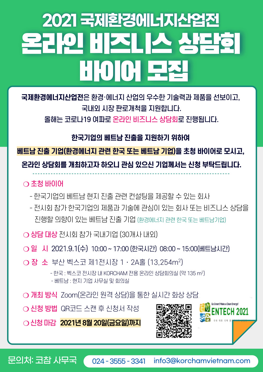 한국기업의 베트남 진출을 지원하기 위하여 베트남 진출 기업(환경 에너지 관련 한국 또는 베트남 기업)를 초청 바이어로 모시고, 온라인 상담회를 개최하고자 하오니 관심 있으신 회사는 신청 부탁드립니다.