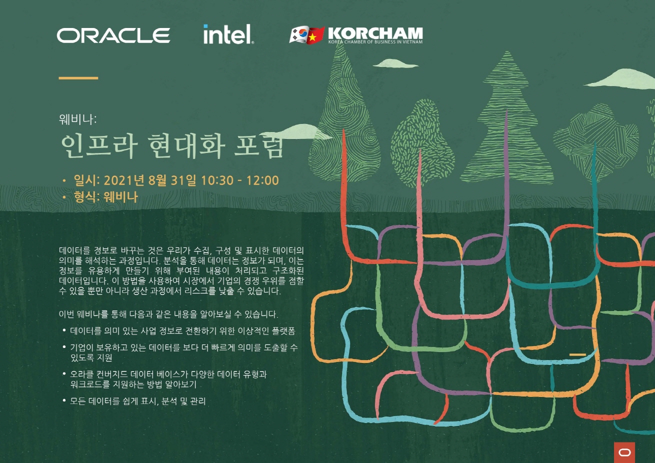 코참과 오라클(매출 규모 세계 2위의 소프트웨어 그룹)에서 2021년 8월 31일(화) 오전 10:30 - 12:00 웨비나 – '인프라 현대화 포럼’ 주제로 웨비나 (줌 화상 세미나)를 개최합니다.