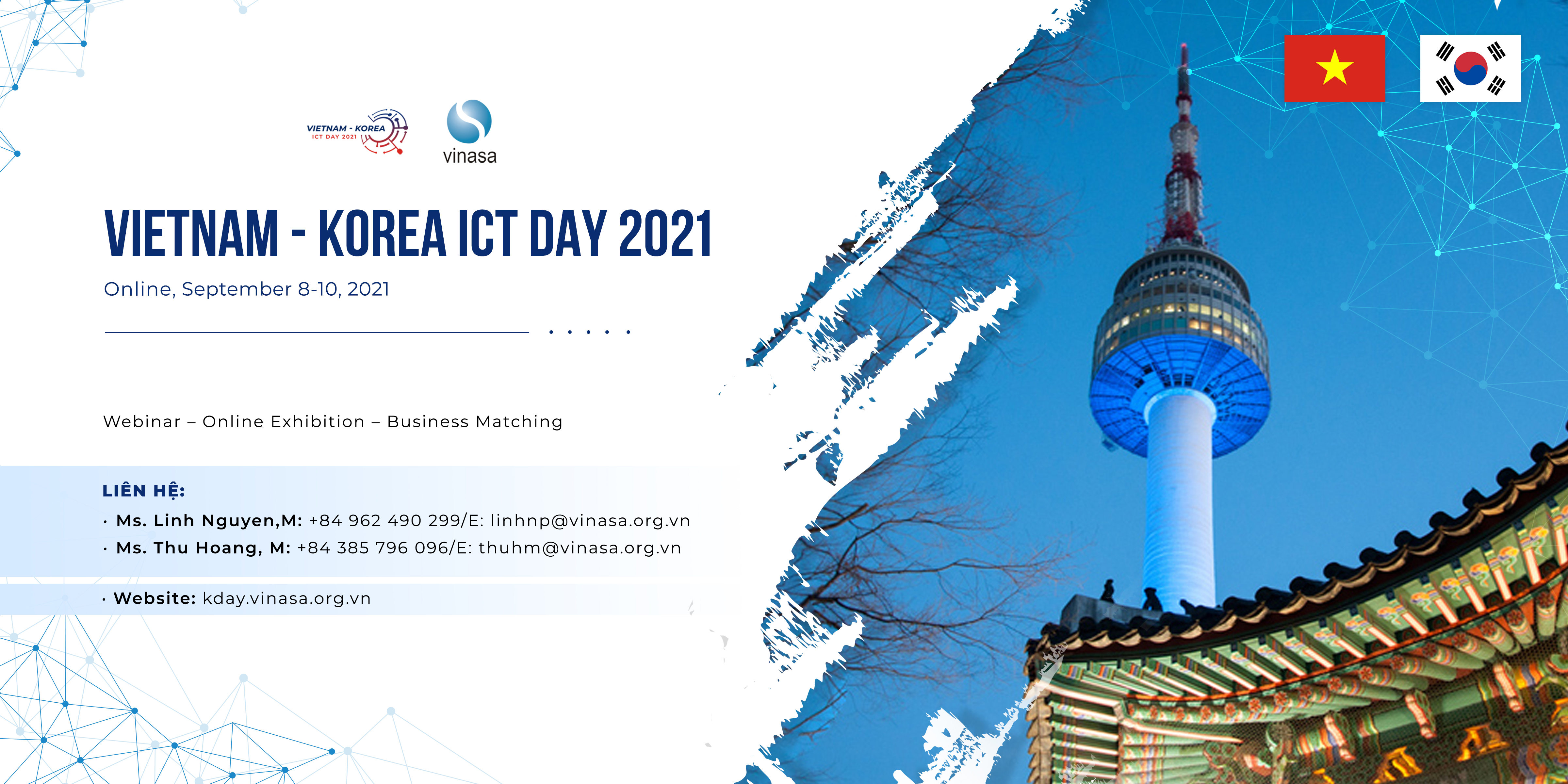 Join our largest and most effective online seminar and business matching with Vietnamese companies in ICT field to explore business cooperation opportunities, which is organized by Vietnam Software and IT services Association (VINASA), The Federation of Korean Information Industries (FKII), Korea IT Cooperation Center (KICC), in coordination with KOSSA, ACSB, KORCHAM, AIC, KBIZ, etc. Details:
