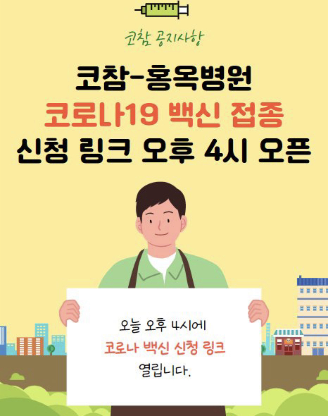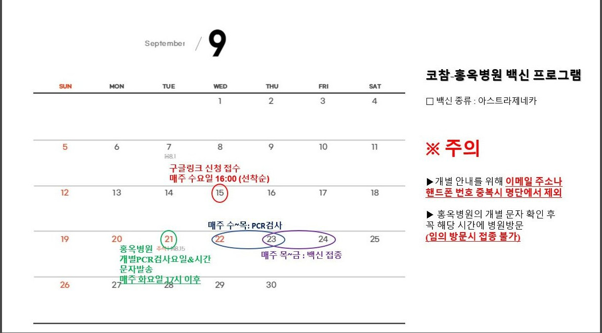 코참-홍옥병원 3번째 백신 접종 접수를 오늘 오후에 시작합니다.