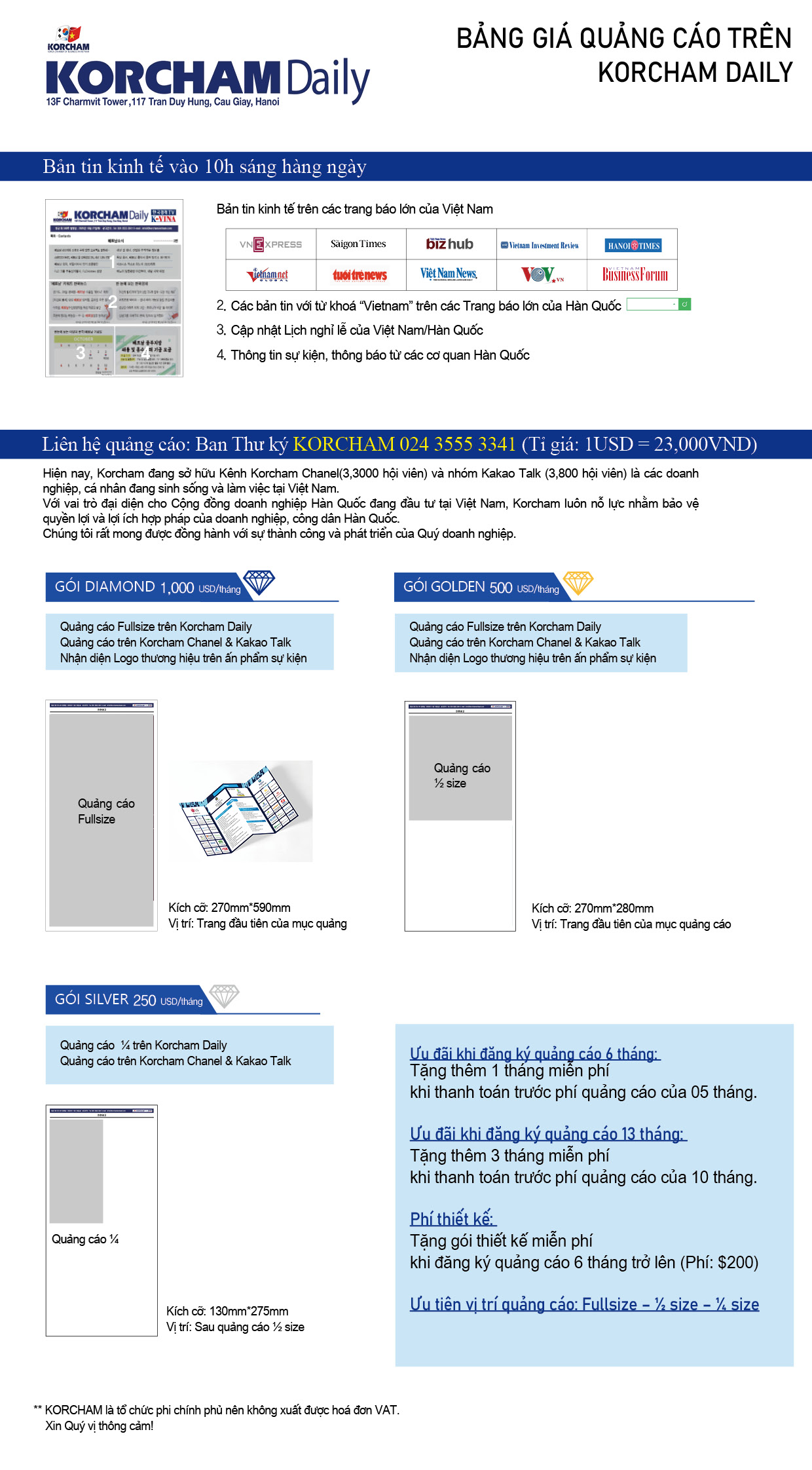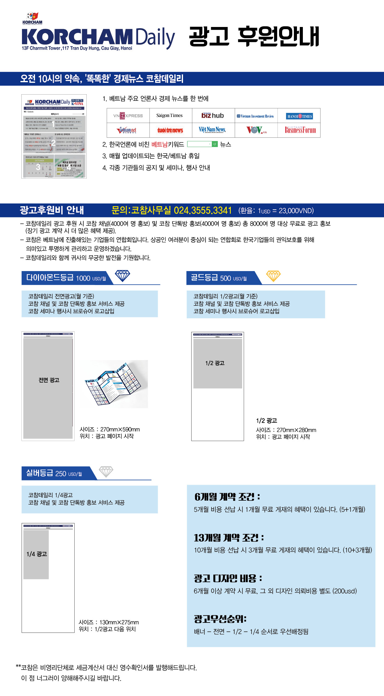 궁금한 사항은 코참데일리 광고국 메일(ad@kochamvietnam.com)이나 전화(024 3555 3341)로 문의 주세요.