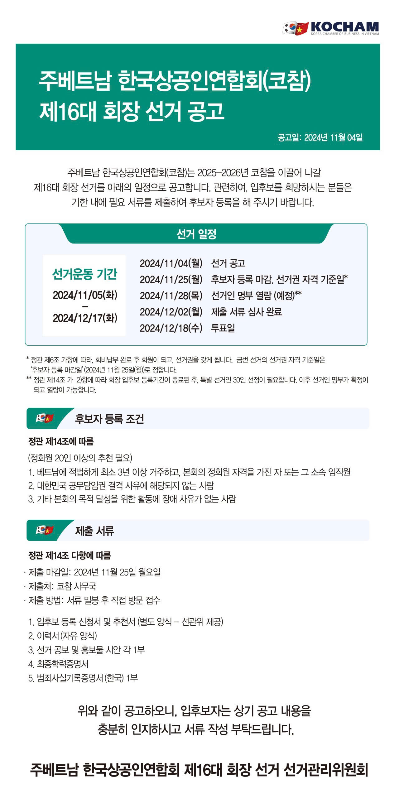 주베트남 한국상공인연합회(코참)는 2025년부터 2026년까지 코참을 이끌어 나갈 제16대 회장을 선출하기 위하여 선거 일정 공고와 함께 제출 서류 양식을 게재합니다.