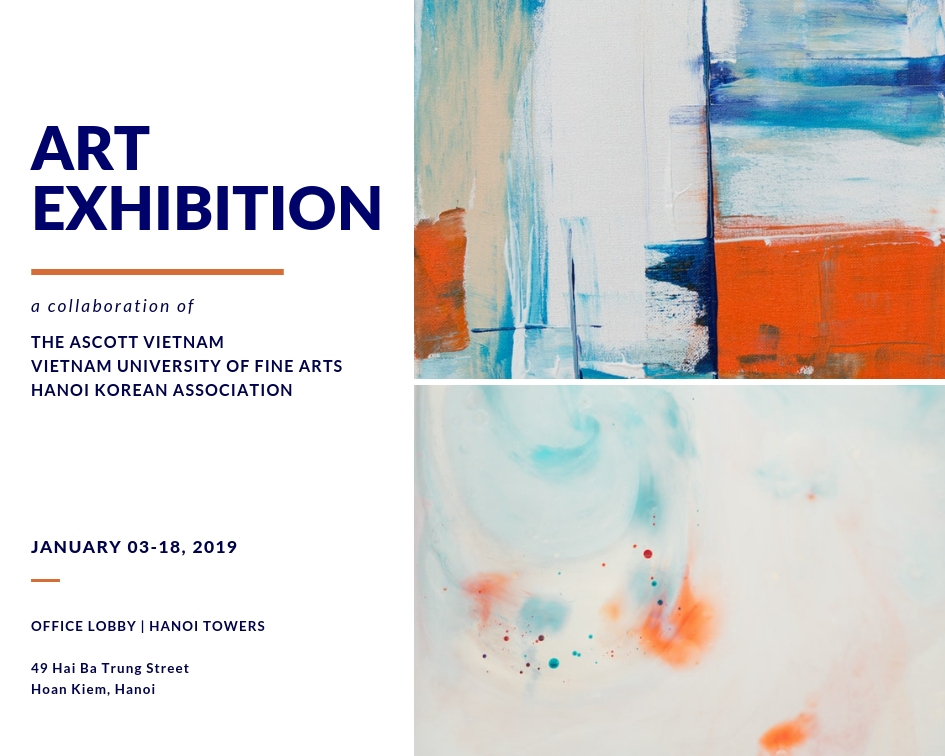 서머셋 그랜드 하노이 서비스 레지던스는 1월3일 ~ 1월18일까지 서머셋 그랜드 하노이 건물 1층 (49, Hai Ba Trung street, Hanoi Tower) 오피스 로비에서 한국 예술가들과 베트남 예술가와 하노이 예술 대학교가 함께 하는 한-베 문화 교류 전시회를 개최합니다.