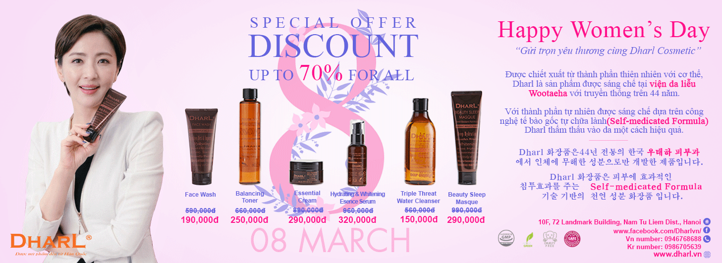 저희는 44년 전통의 우태하 피부과에서 연구,개발한 Dharl 화장품의 베트남 독점판매회사입니다.‘여성의 날’을 기념하는 파격 세일을 진행합니다.