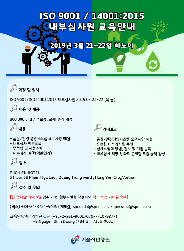 ISO 9001:2015 및 ISO 14001:2015 표준 개정에 따라 당 인증원에서는 베트남 하노이 지역에 계시는 모든