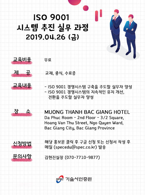 2019년 04월 26일(금) ISO 9001 시스템 추진 실무 과정을 개최합니다.
