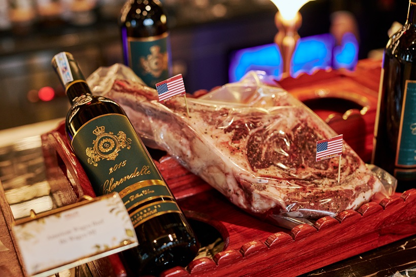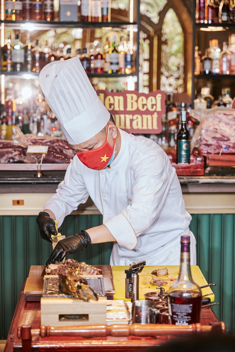 F29 Golden Beef 레스토랑에서 호텔 셰프가 직접 황금 토마호크 스테이크를 준비합니다.