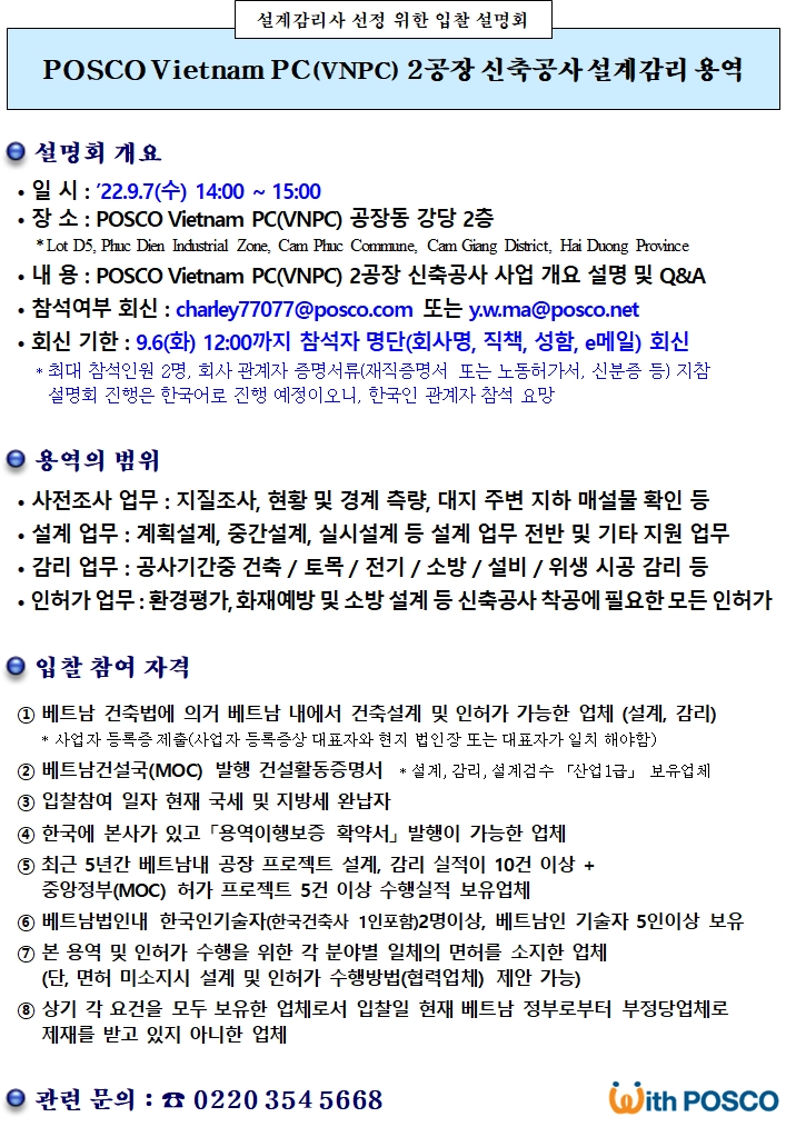 • 내 용 : POSCO Vietnam PC(VNPC) 2공장 신축공사 사업 개요 설명 및 Q&A