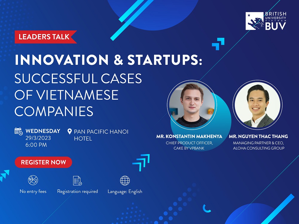 베트남 영국 국제 대학교(British University Vietnam – BUV)는 ‘혁신과 창업 – 베트남에서 성공적인 사업을 이끈 기업가들’이라는 주제로 개최되는 Leaders Talk 행사의 참가 신청을 받고 있습니다