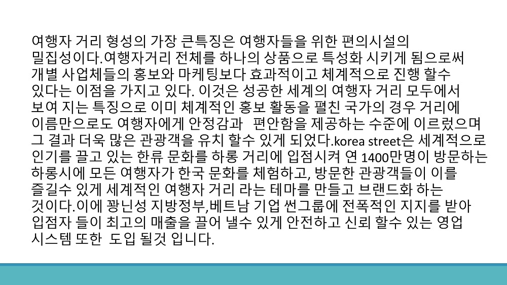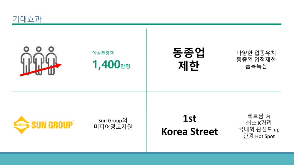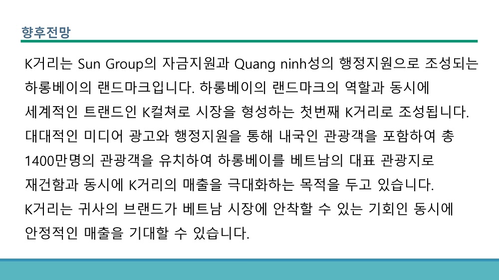 코참회원사인 썬트래블에서 하롱베이 주요도로 중의 한 곳에서 한국거리를 2023년 7월 오픈할 예정입니다. 썬월드 근처의 관광지 인근이며, 베트남 대기업 썬그룹이 직접 마켓팅을 진행한다고 합니다. 보다 자세한 사항에 대해서는 하단의 사업계획서를 참조해주시고 썬트래블과 korea street 에 입점하실 분들을 모집하고있습니다.