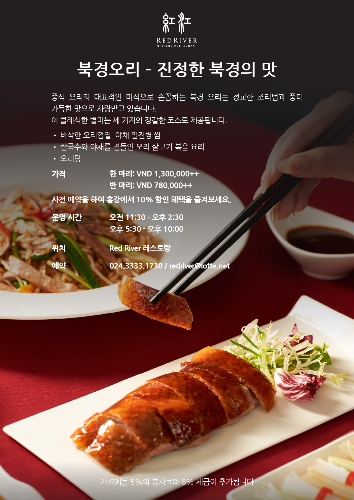 중식 요리의 대표적인 미식으로 손꼽히는 북경 오리는 정교한 조리법과 풍미 가득한 맛으로 사랑받고 있습니다. 이 클래식한 별미는 레드 리버 레스토랑에서 세 가지의 정갈한 코스로 제공됩니다.