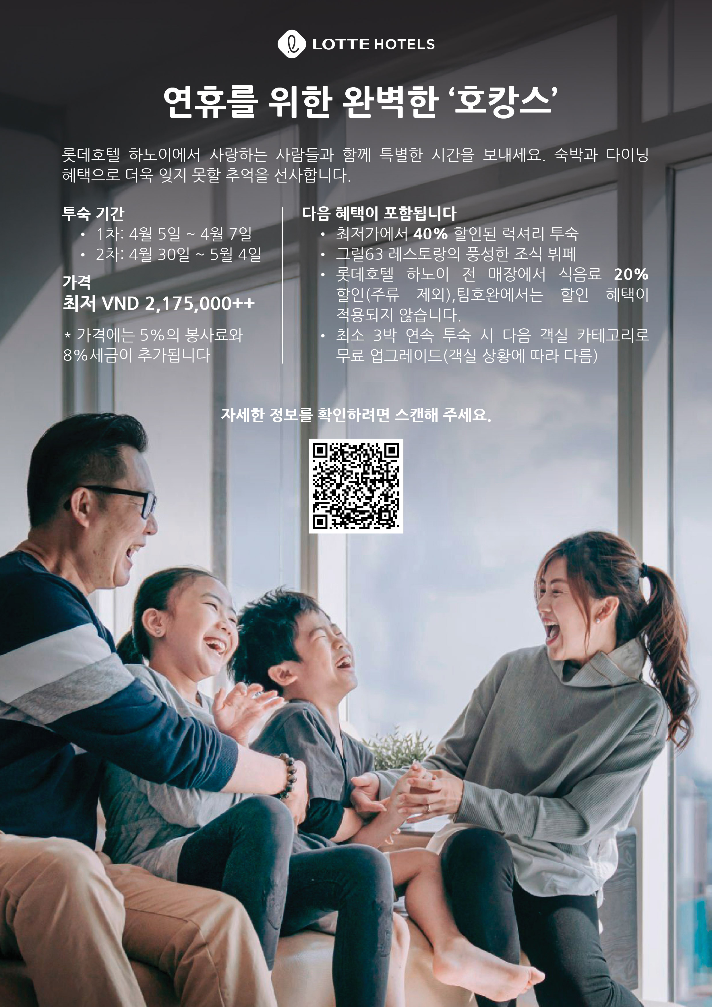 - 롯데호텔 하노이 전 매장에서 식음료 20% 할인(주류 제외), 팀호완에서는 할인 혜택이 적용되지 않습니다.
