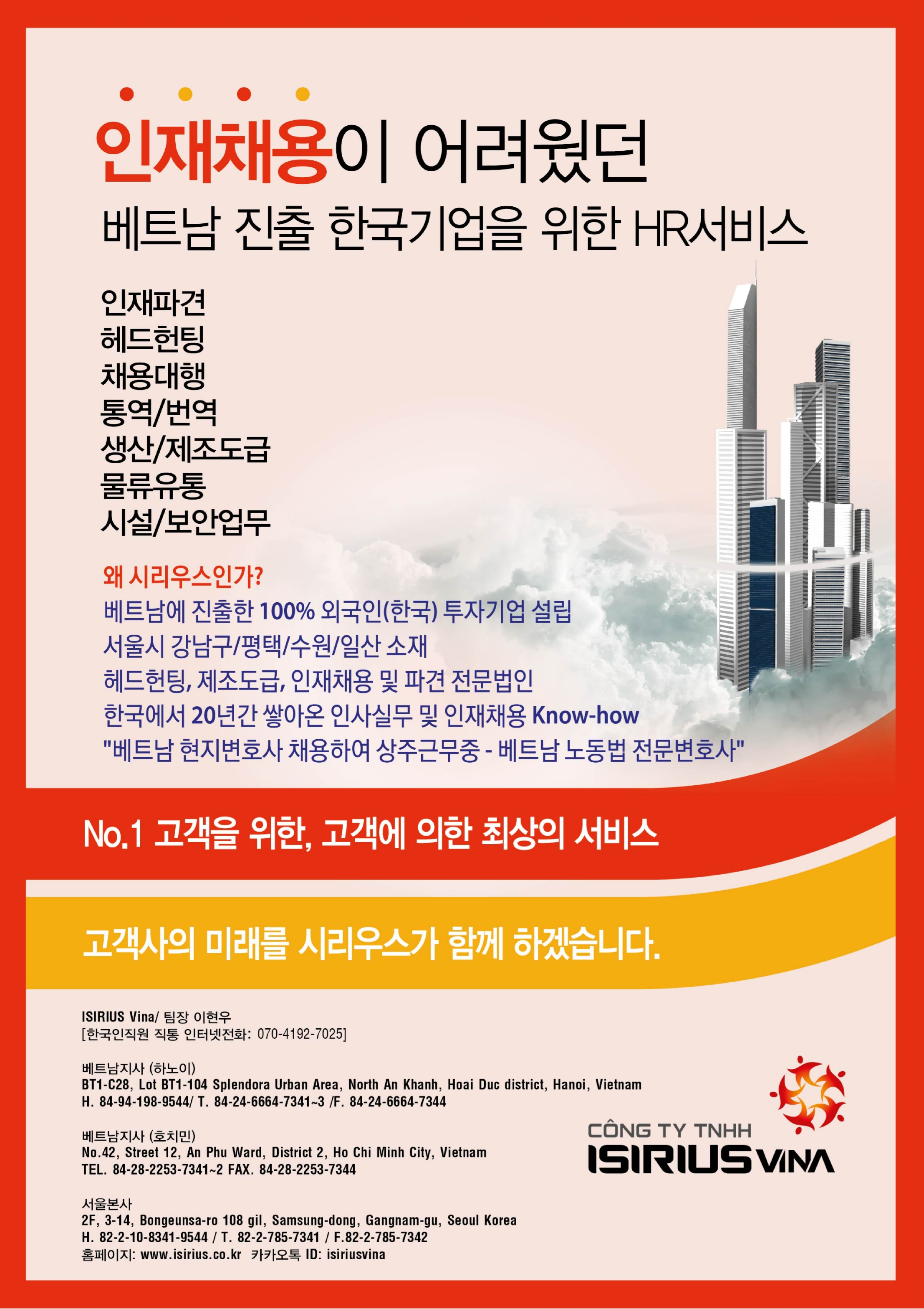고급전문 인력 및 베트남 현지 필요인력, 베트남 현지 통역원,번역원 등 업무에 필요한 인재의 필요시 한국본사와 유기적인 협력을 통하여 고객의 요구에 최적화된 인재를 선발하여 드립니다.