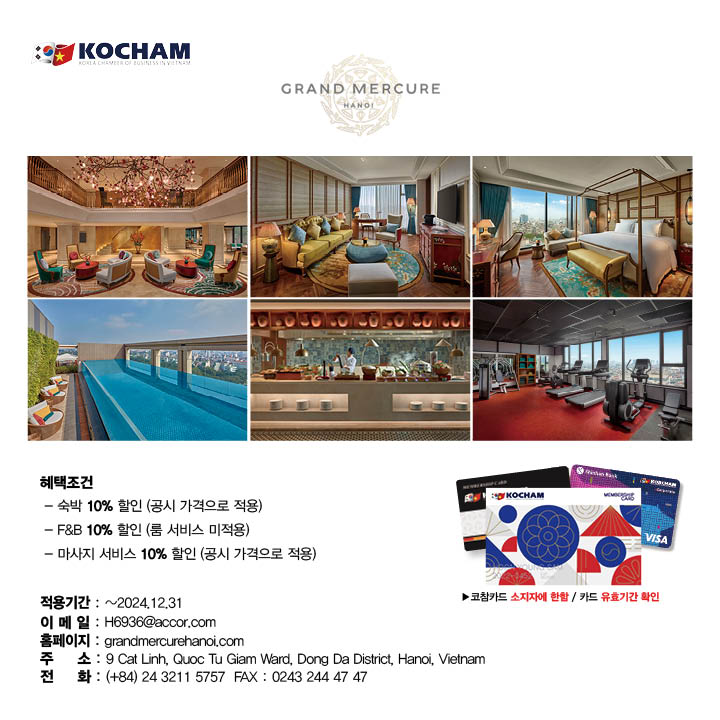 호텔 그랜드머큐어 하노이에서 코참 회원사 여러분께 할인 혜택을 제공합니다.